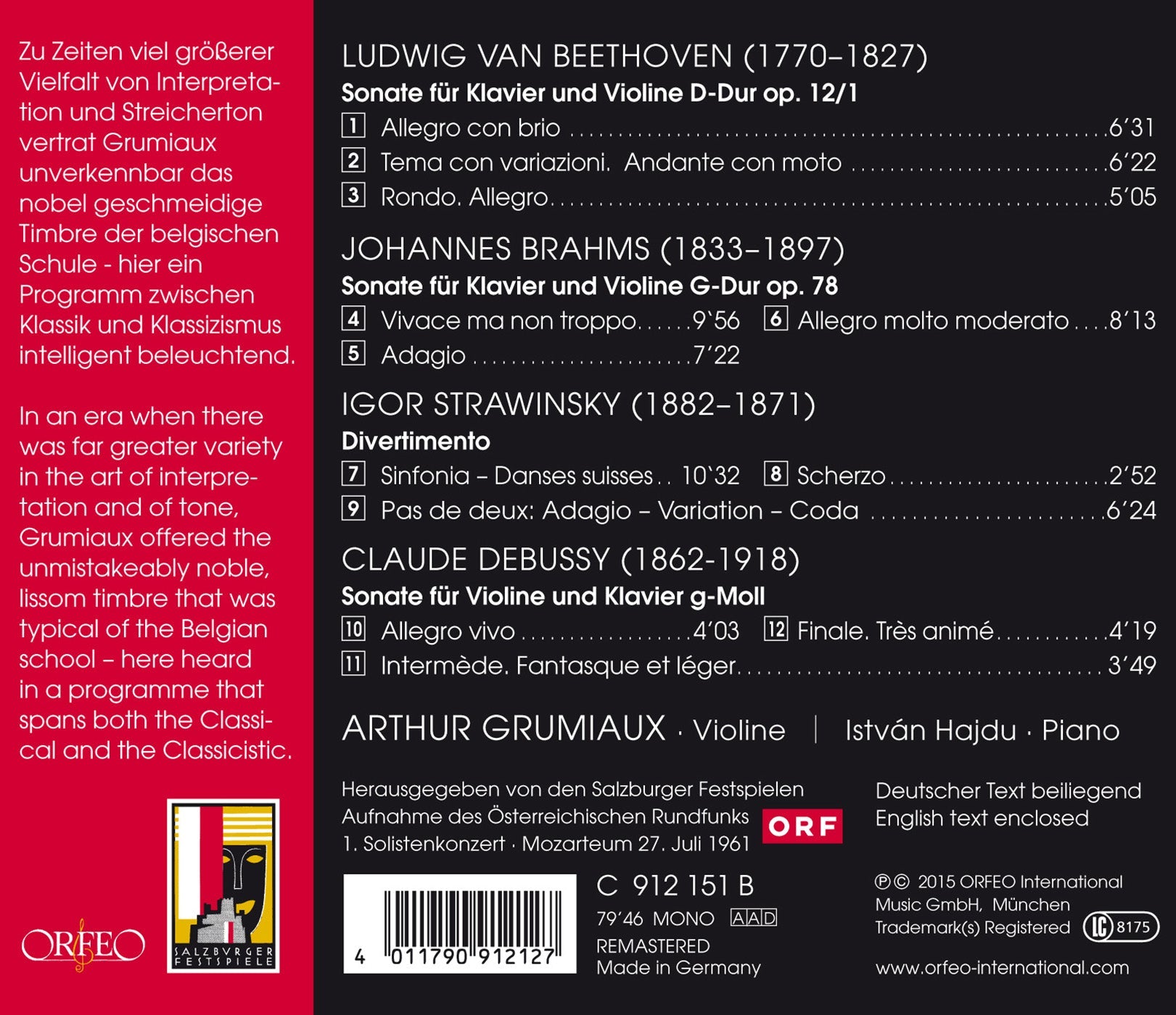 In an era that tolerated, expected and accepted far greater variety of interpretation and tone than the current and persistent "new internationalism" approach that admits far less in the way of regional and personal variation among players and ensembles, violinist Arthur Grumiaux offered the unmistakably noble, lissome timbre typical of the Belgian school - here heard in a varied live program recorded 27 July 1961 that spans the Classical (Beethoven), Romantic (Brahms) and Modern (Stravinsky, Debussy) eras. Pianist Istv�n Hadju, who often recorded with Mr. Grumiaux, provides accompaniment.